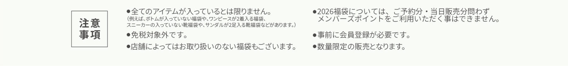 ・本年より福袋の購入時に、当社発行のポイントや、自社商品券、値引き券、クーポンのご利用はできません。